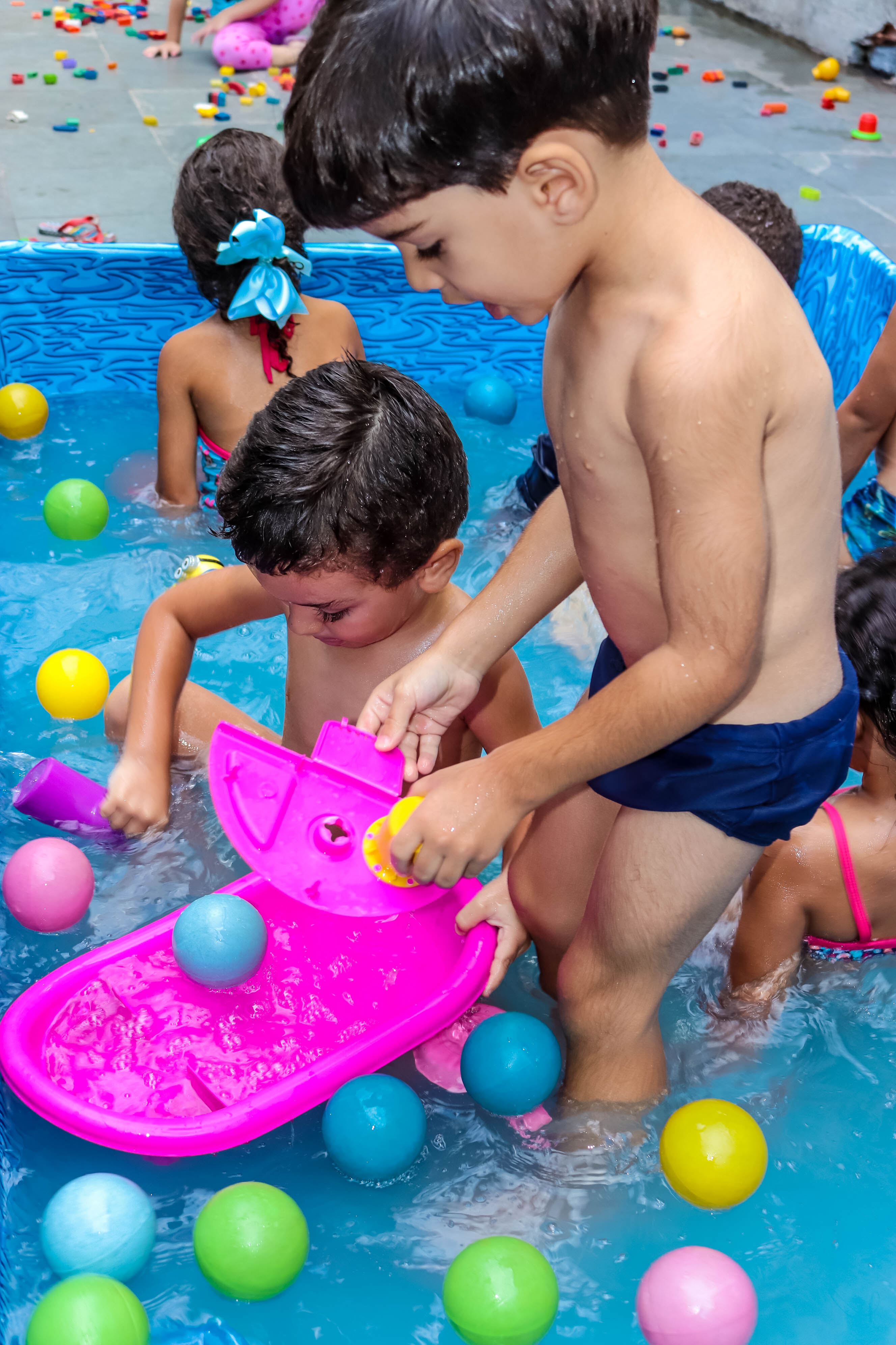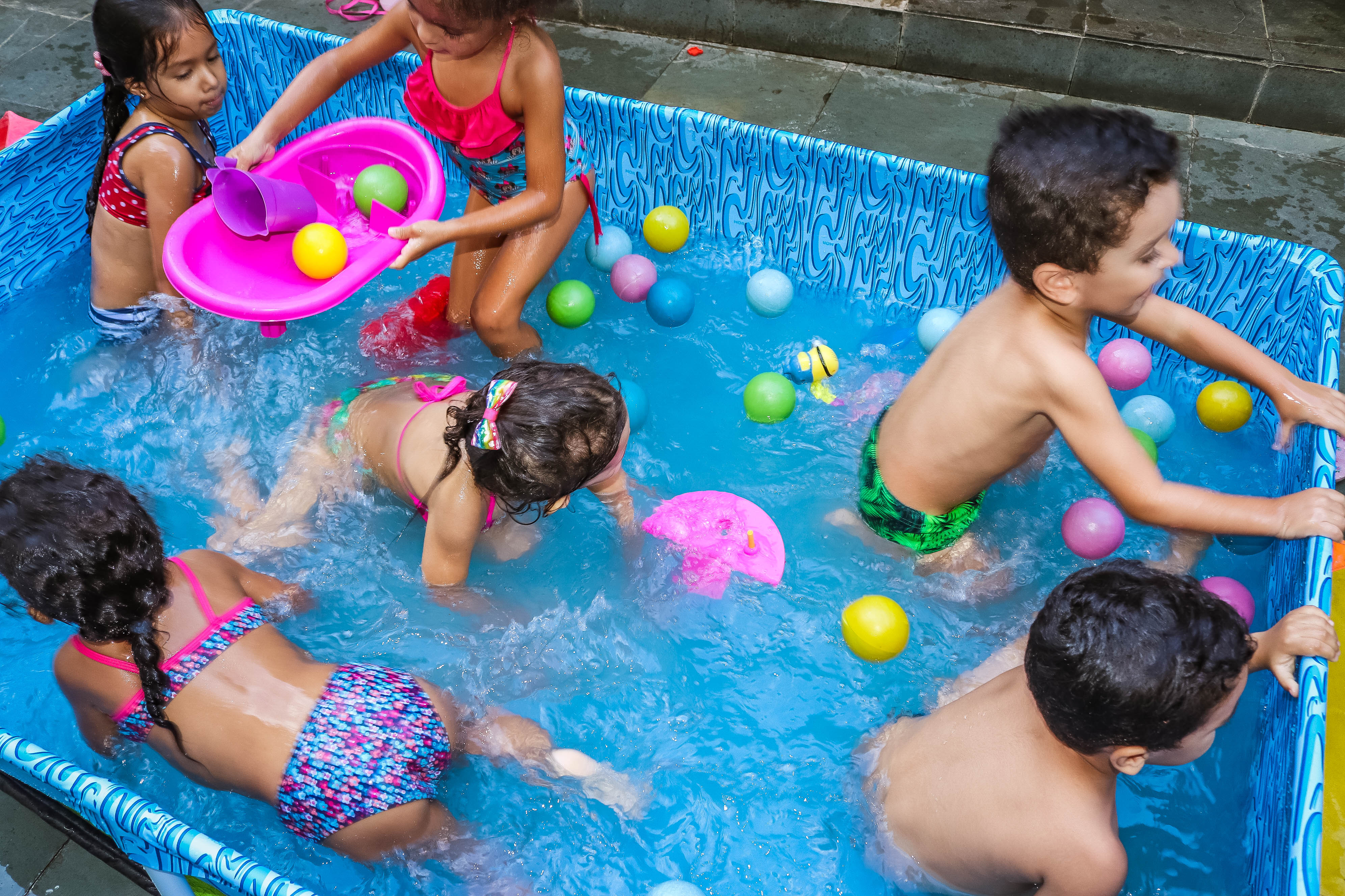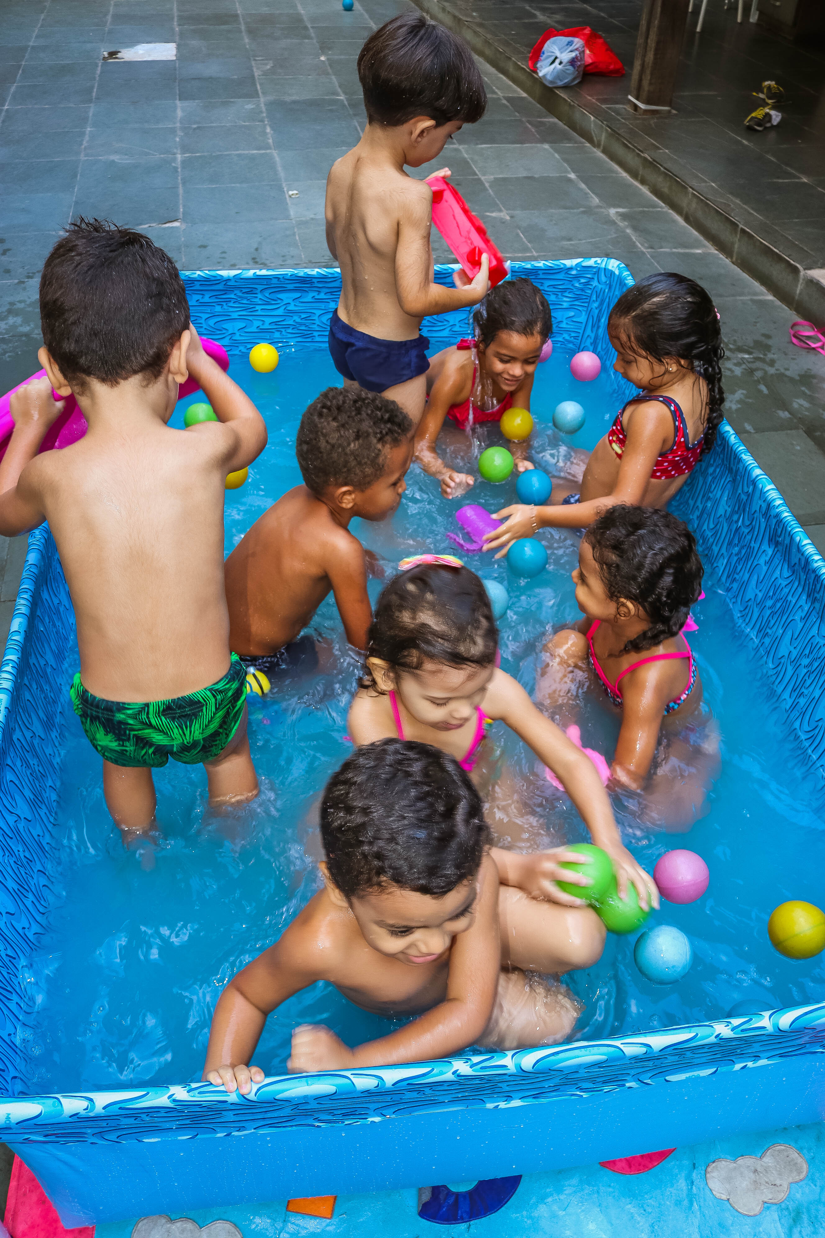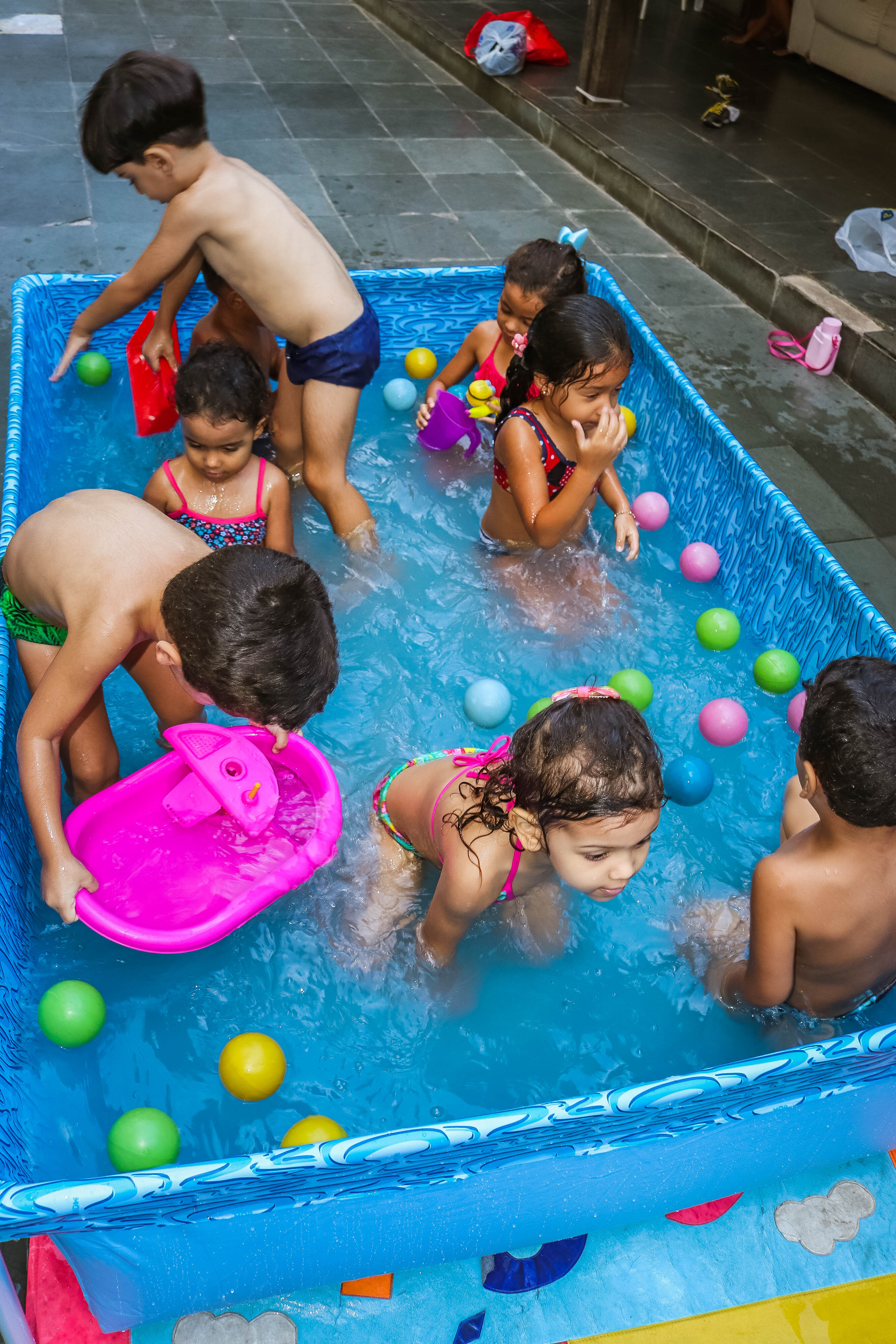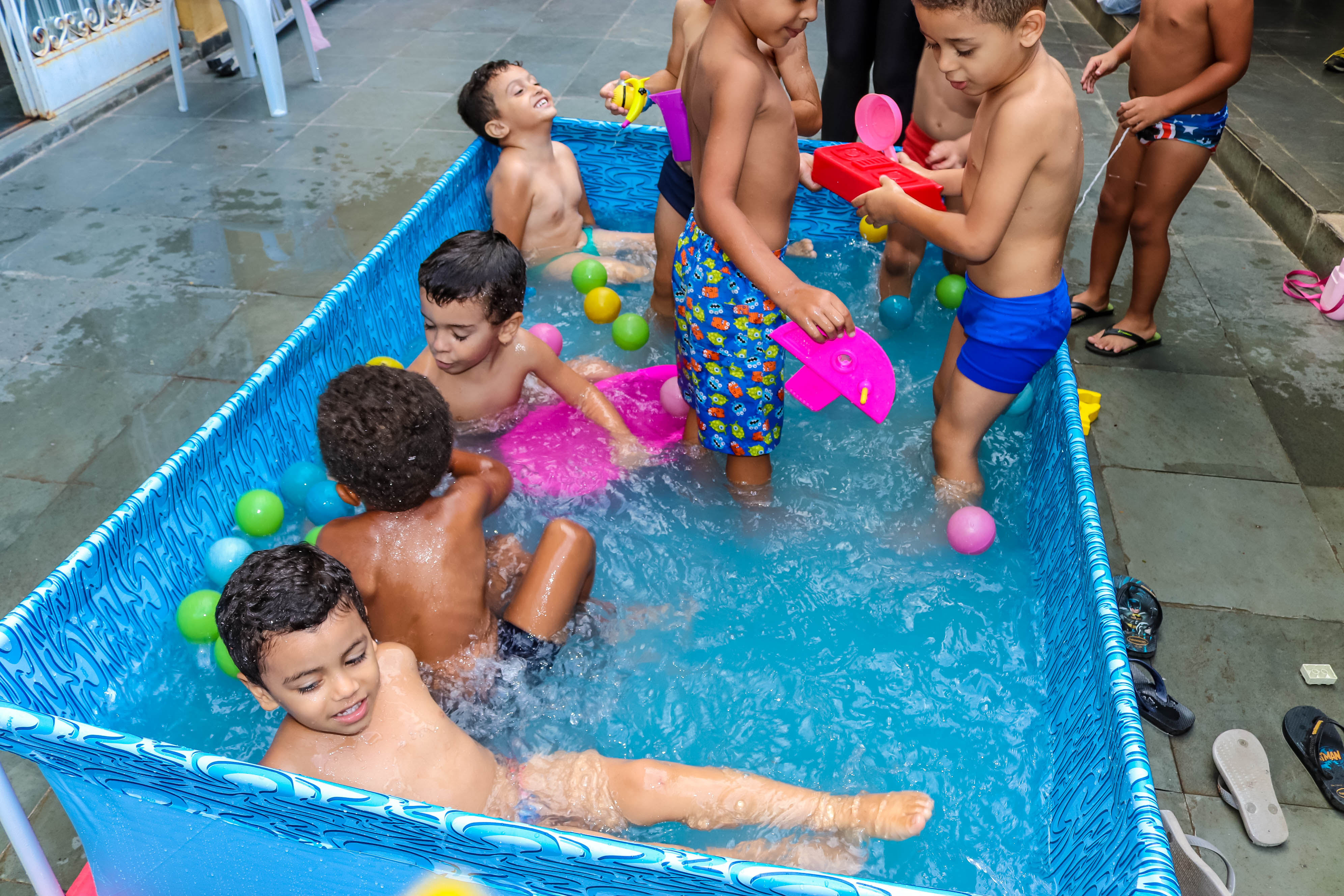 Pensando nisso, o banho de piscina propicia um excelente momento para o desenvolvimento do brincar e do criar.