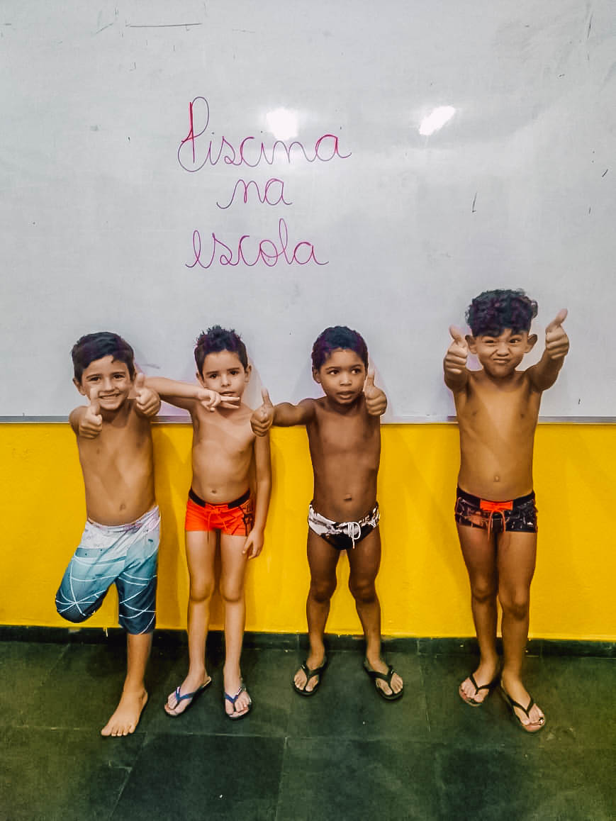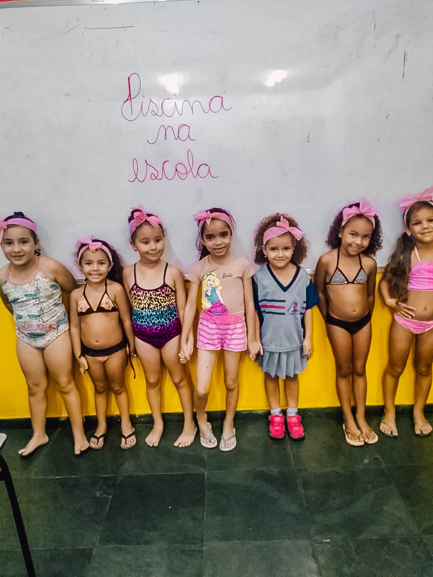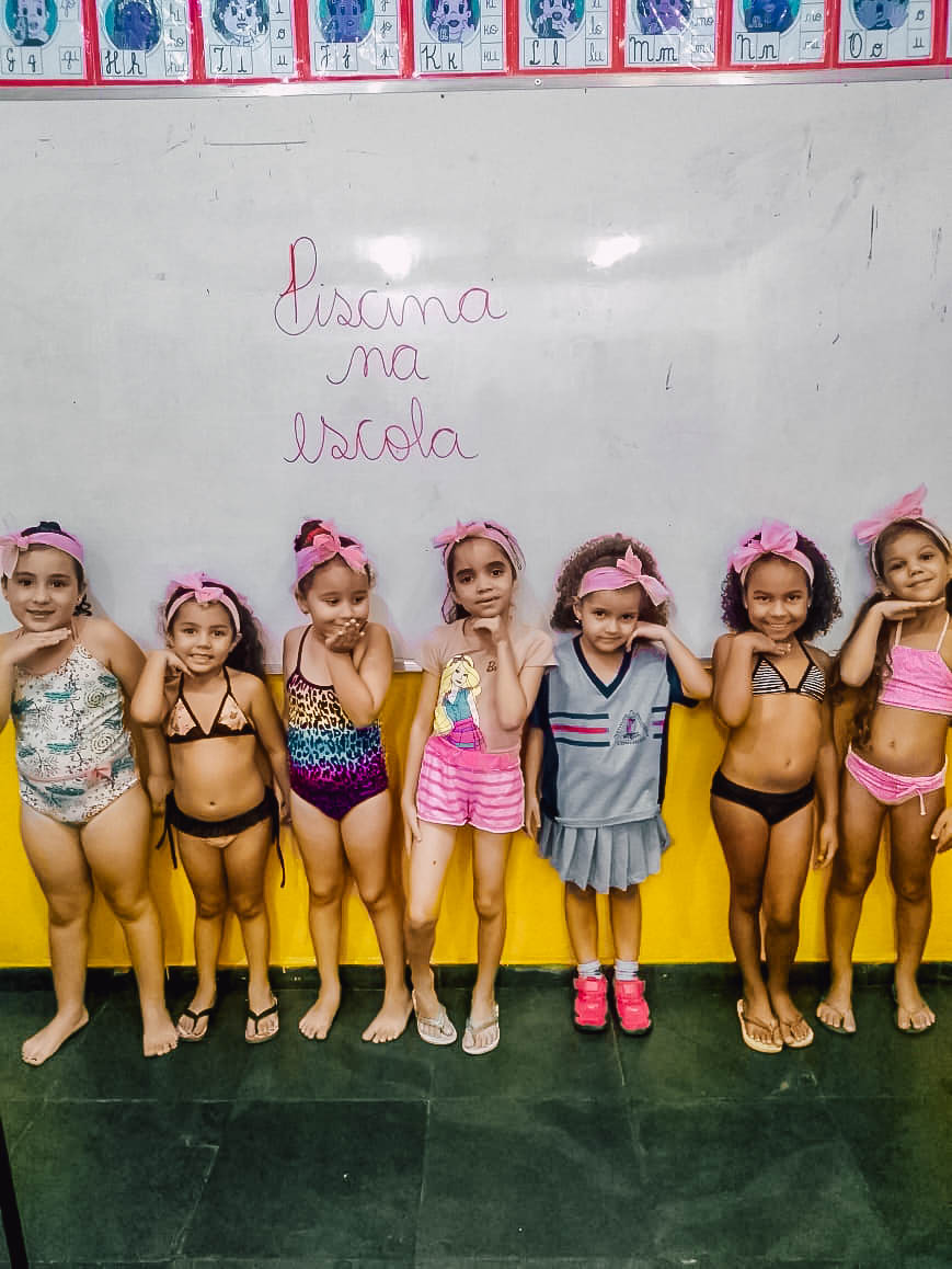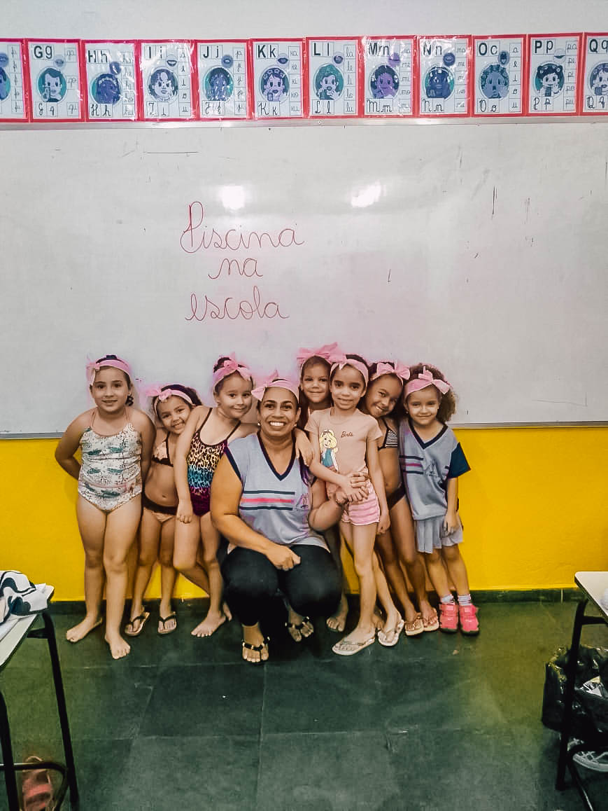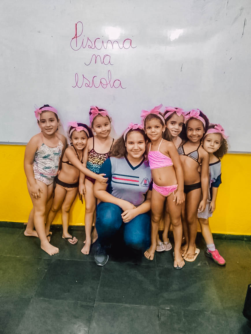 O banho de piscina é uma atividade recreativa que estimula a socialização, a coordenação motora e o autocuidado (enxugar-se, se vestir, guardar suas roupas na mochila, entre outros).