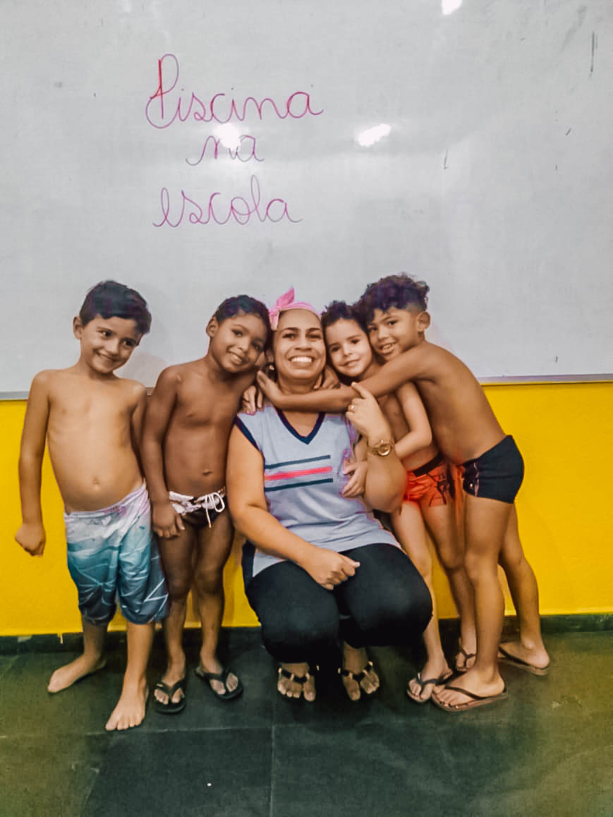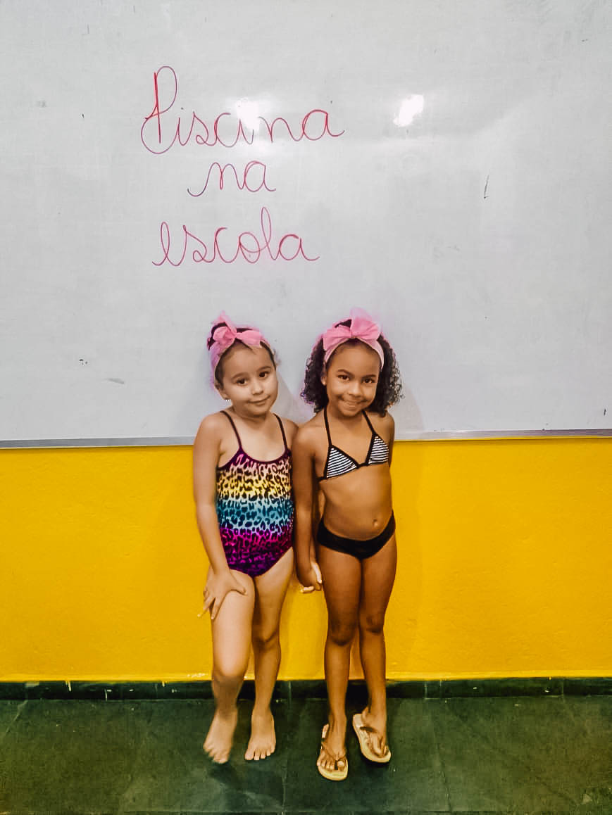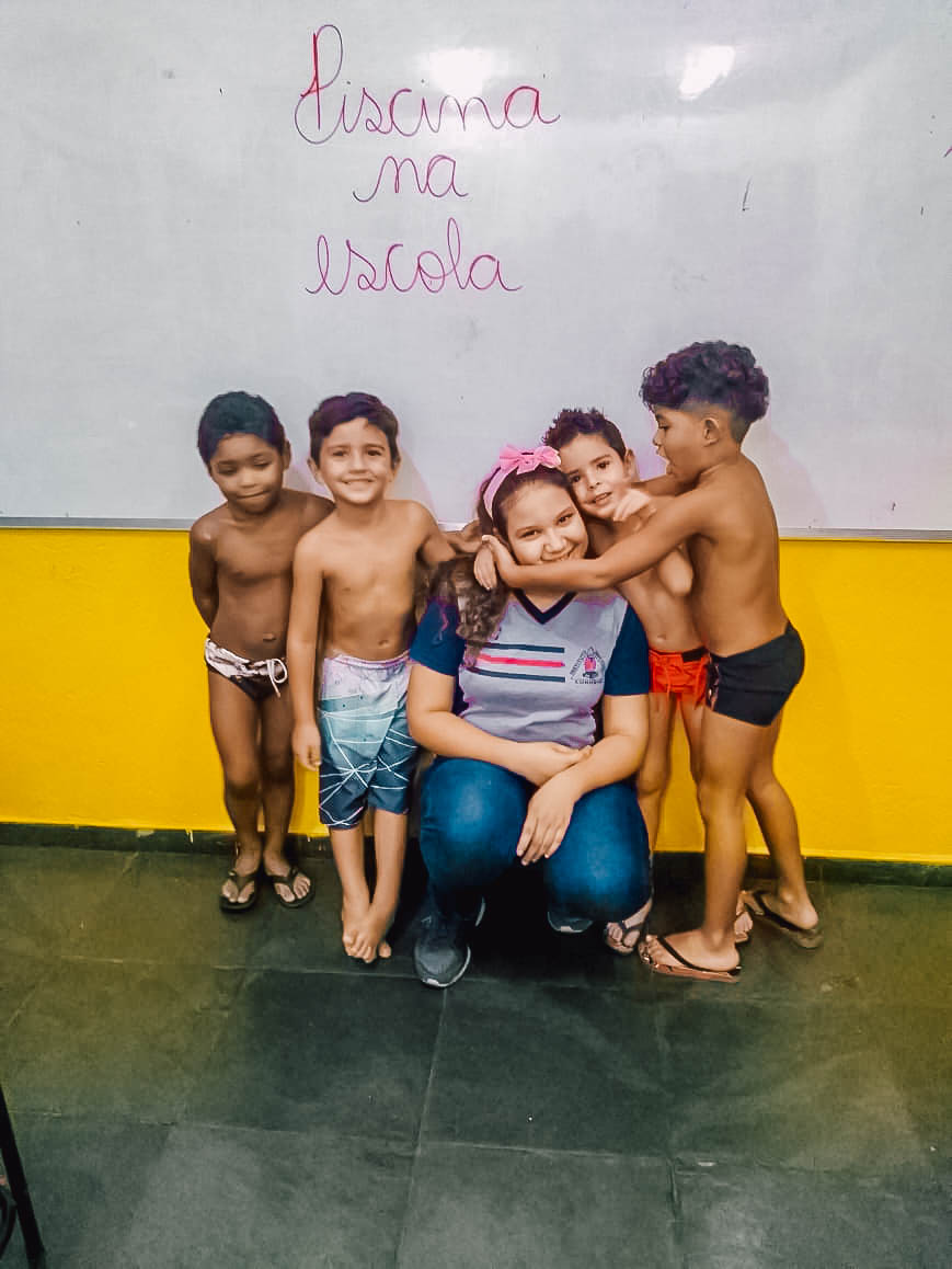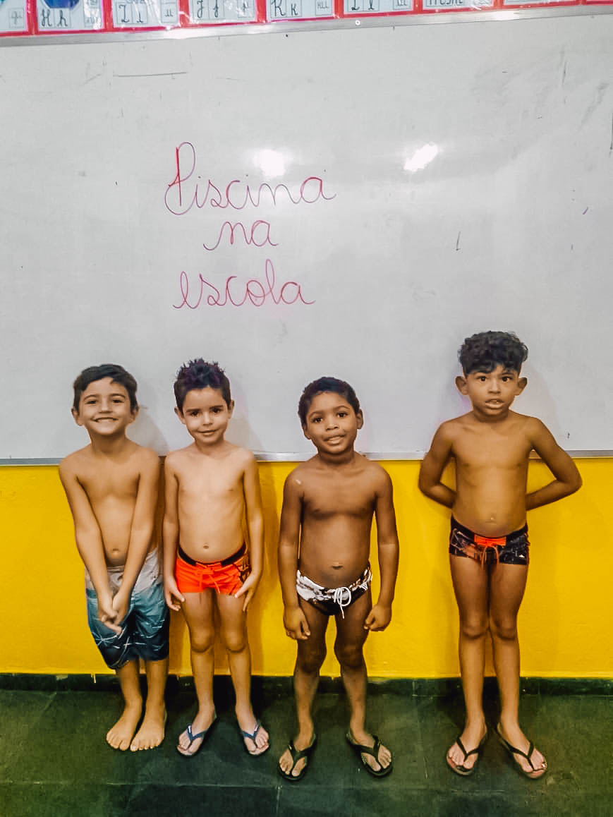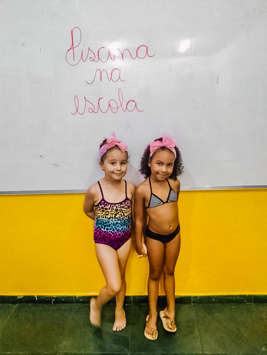 O banho de piscina é uma atividade recreativa que estimula a socialização, a coordenação motora e o autocuidado (enxugar-se, se vestir, guardar suas roupas na mochila, entre outros).