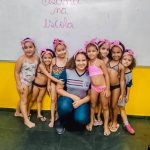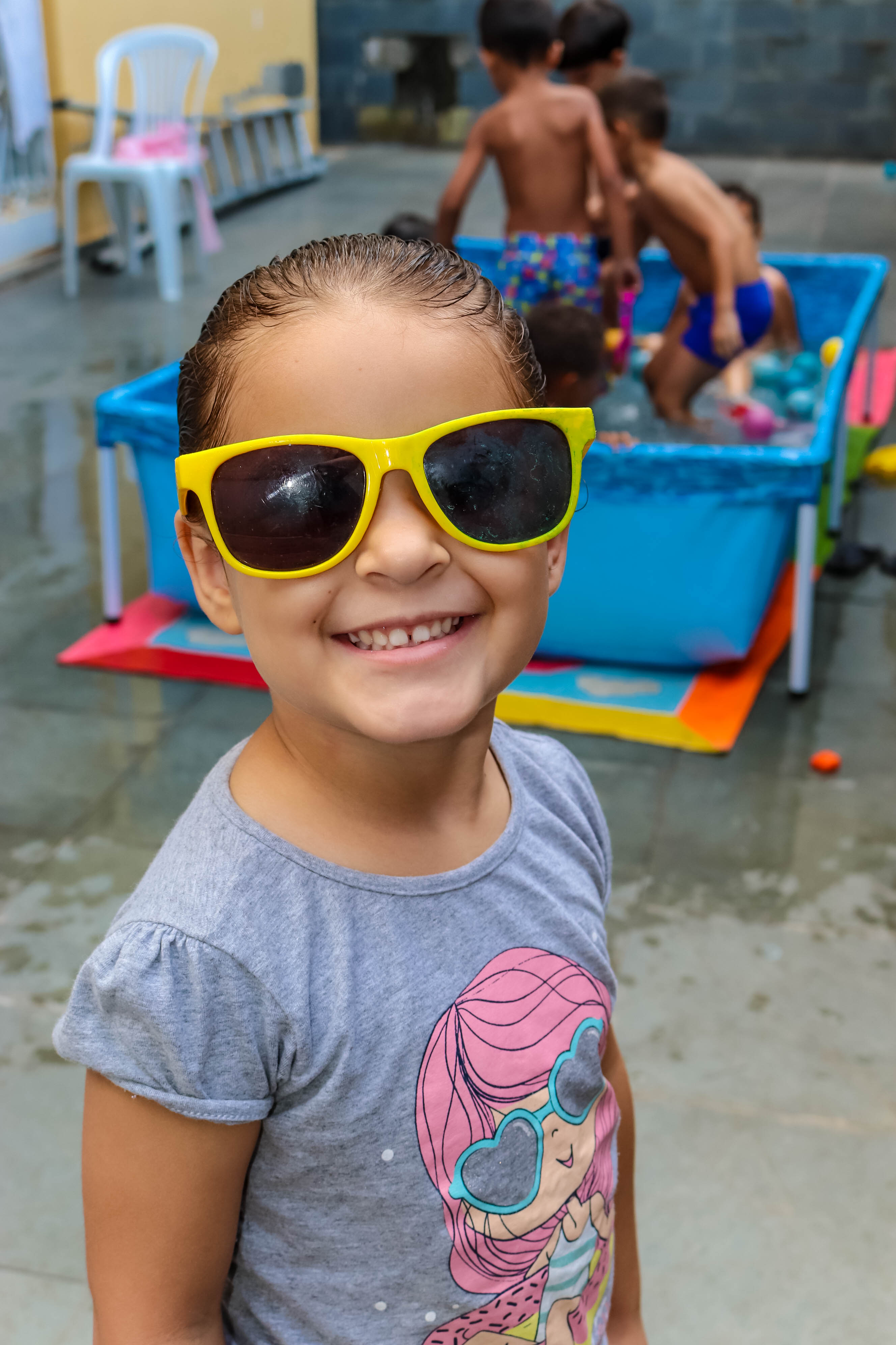Brincadeiras na água com os colegas, um sorriso das professoras atentas, as fotinhas da turma no primeiro dia de piscina do ano!